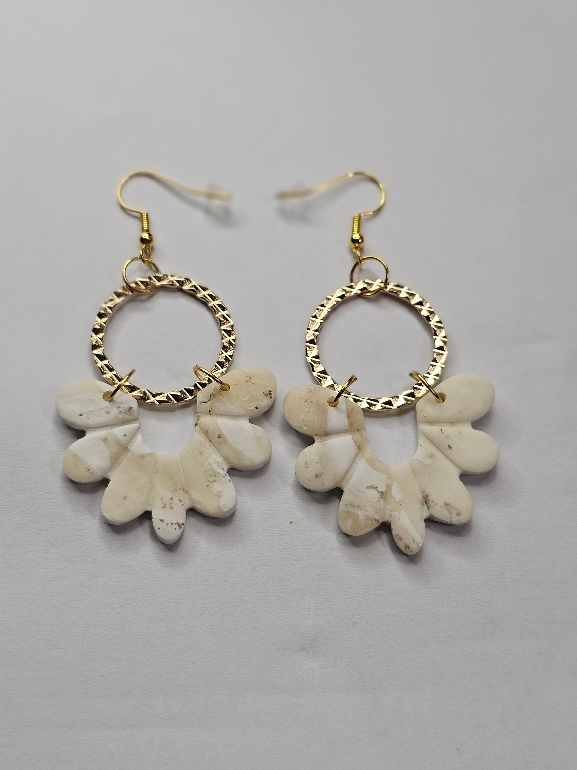 Elegant translucent white and white chandelier earrings with a golden loop accent. Hypoallergenic golden hooks provide both style and comfort. Add a touch of sophistication to any outfit with these exquisite earrings.